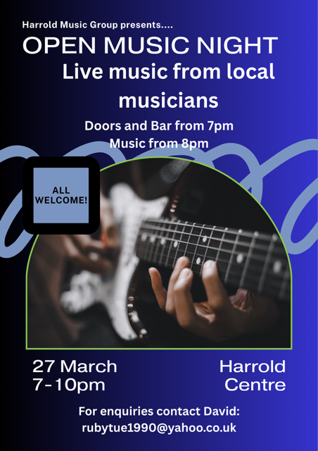 Harrold Open Music Night – 27th March 2026 by Harrold Centre | Feb 15, 2026 | What's On Harrold Open Music Night Friday 27th March 2026 Music from 8pm – 10pm Doors and Bar open from 7pm Future dates May 8th June 5th July 3rd September 25th October 30th November 27th